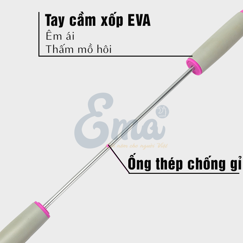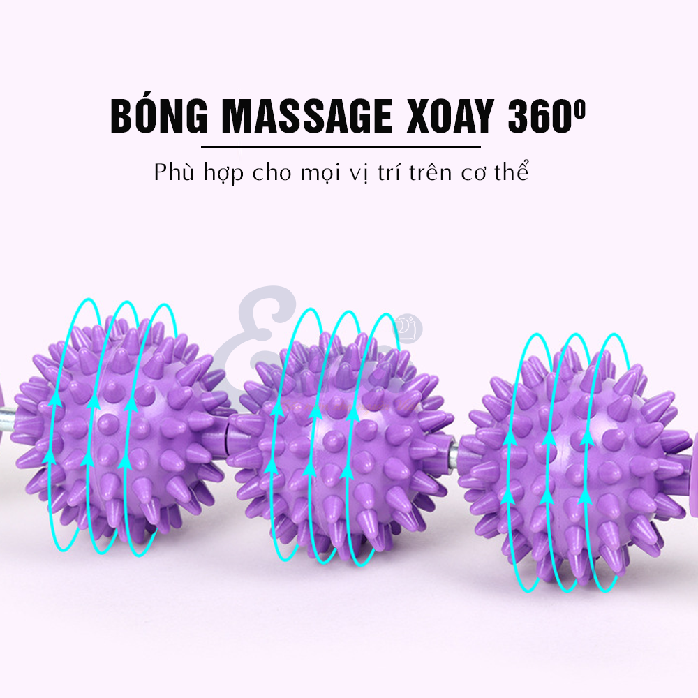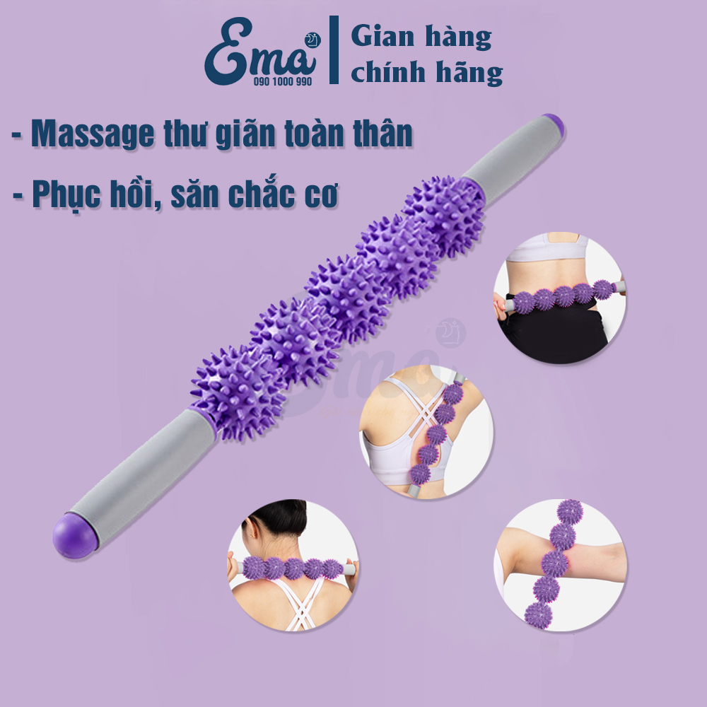 - Thiết kế dạng gậy chắc chắn với lõi là ống thép chống gỉ và tay cầm làm từ xốp EVA kết hợp với con lăn gồm 5 bóng gai 360°, gậy lăn Massage giãn cơ giúp Ema có thể Massage toàn cơ thể dễ dàng như Massage cổ, lưng hay chân, bụ