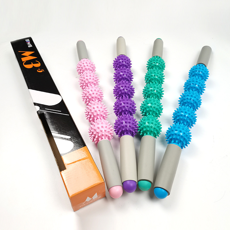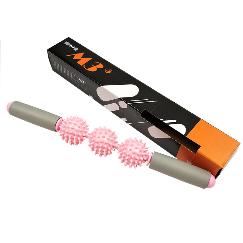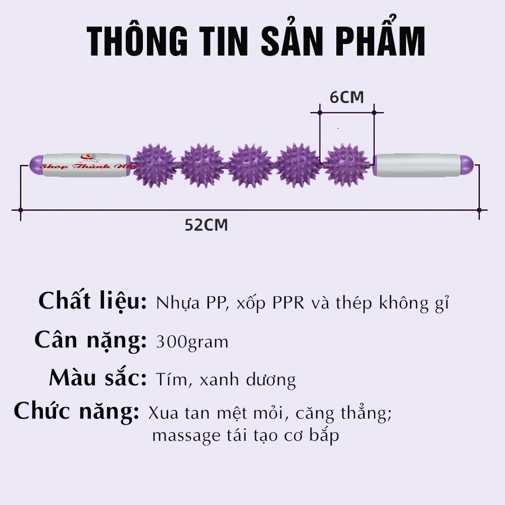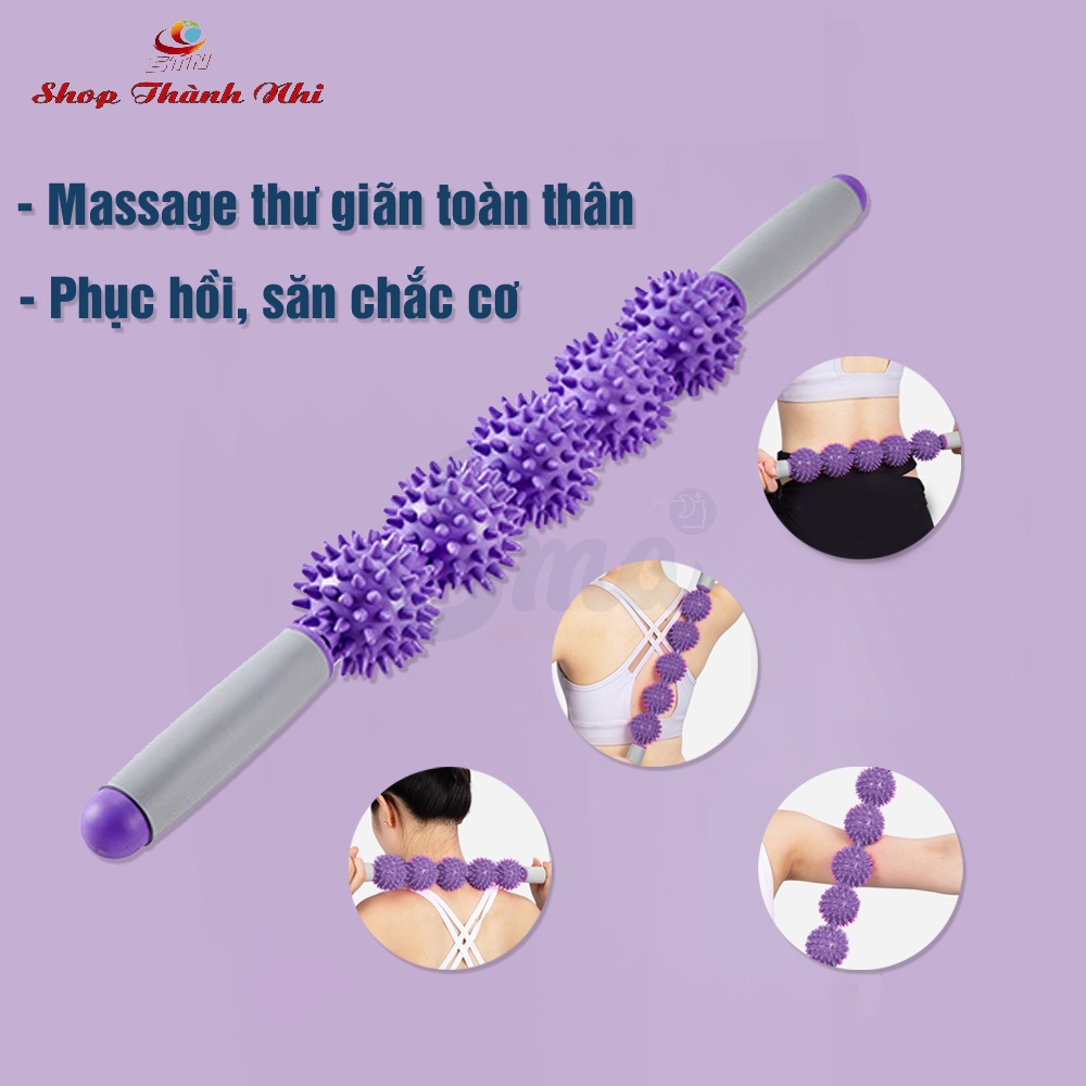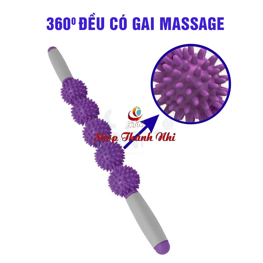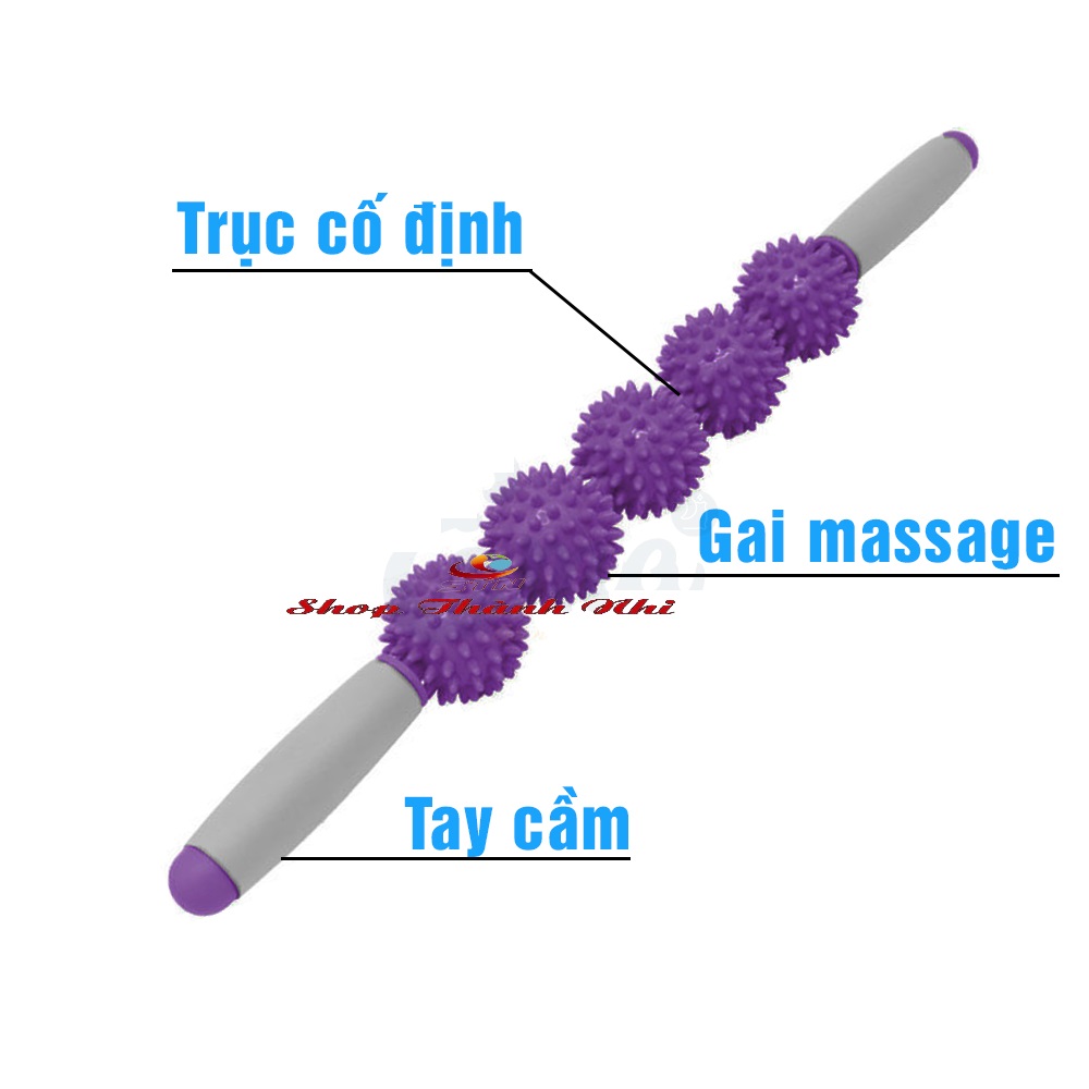 - Thiết kế dạng gậy chắc chắn với lõi là ống thép chống gỉ và tay cầm làm từ xốp kết hợp với con lăn gồm 5 bóng gai 360°, gậy lăn Massage giãn cơ giúp Ema có thể Massage toàn cơ thể dễ dàng như Massage cổ, lưng hay chân, bụmg