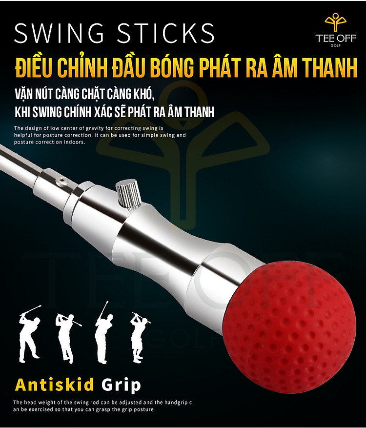 - Đầu gậy tập kỹ thuật làm bằng kim loại thép đúc nguyên khối, bên ngoài bọc lớp cao su dẻo hình quả bóng Golf, lớp dưới đầu gậy là khoảng kim loại thép đúc có chứa bi giữ nhịp, bên ngoài là núm vặn điều chỉnh có thể khóa không cho bị chạy hoặc mở cho bi chạy.