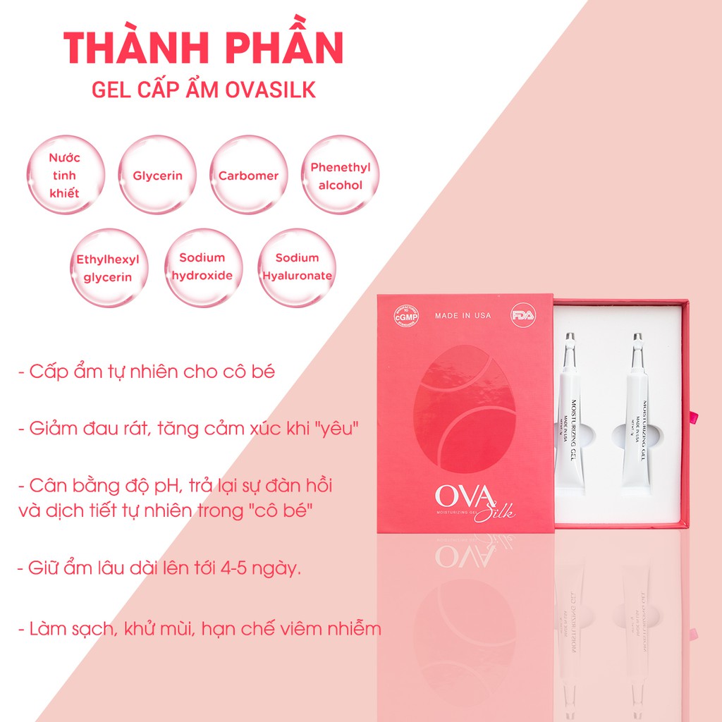Gel bôi trơn âm đạo chính hãng OvaSilk - USA, hỗ trợ, giảm và cấp ẩm âm đạo và an toàn cho vùng kín, 120g MÔ TẢ OVASILK là Gel cấp ẩm và bôi trơn phụ khoa được sản xuất ở Mỹ tại nhà máy đạt tiêu chuẩn FDA (Cục An Toàn Thực Phẩm & Dược Phẩm) & cGMP Hoa Kỳ. Ovasilk cấp ẩm tức thì và duy trì được hiệu quả và tác dụng lên tới 5 ngày liên tiếp. Phù hợp với những người bị khô hạn, đau rát vùng kín do stress, trầm cảm, nội tiết tố thay đổi sau sinh, vv…