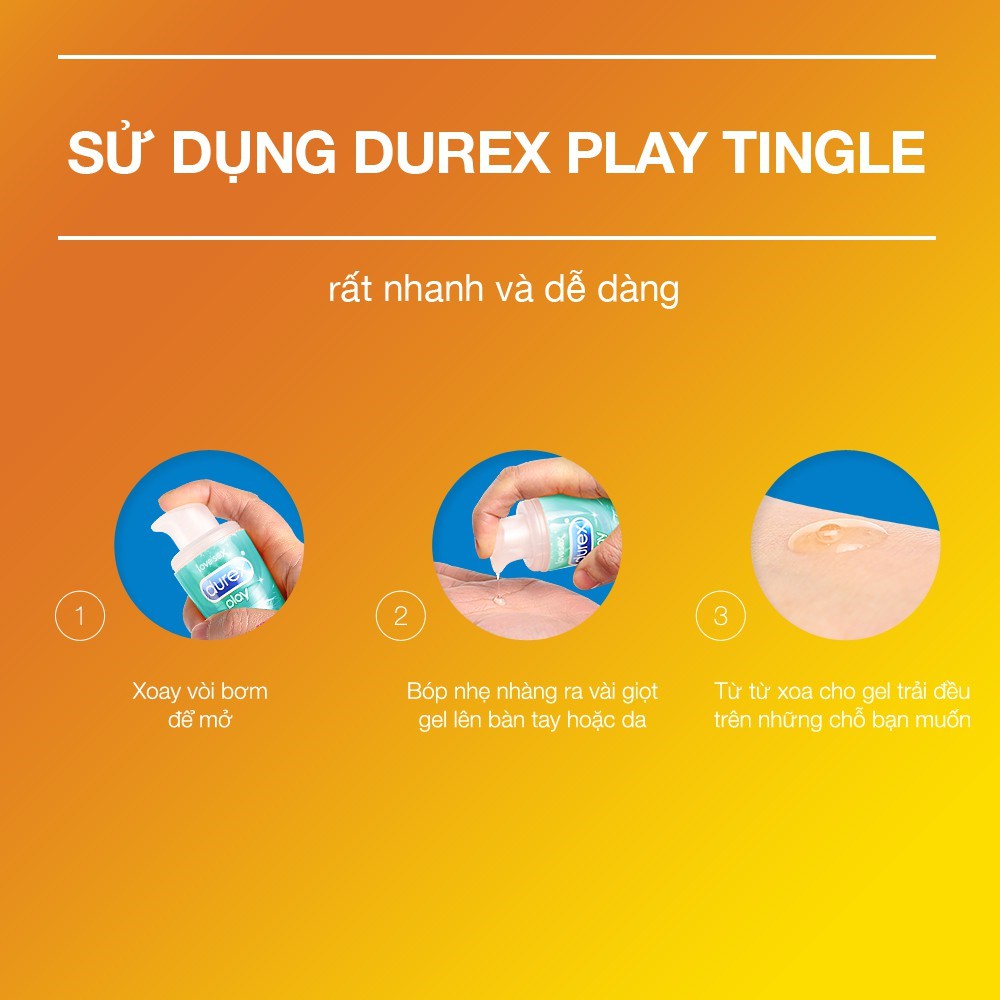 Cách Dùng: Kiểm tra bao bì và hạn sử dụng của sản phẩm, tránh sản phẩm không được đóng chặt, tiếp xúc với không khí quá lâu dẫn tới ảnh hưởng chất lượng bên trong. Lắc đều sản phẩm trước khi sử dụng. Vặn nút bơm và ấn xuống để lấy một vài giọt chất bôi trơn lên ngón tay và bôi lên vùng sinh dục. Gel Bôi Trơn Durex Play Tingling có thể dùng với các loại bao cao su và khi đã mang bao vào có thể bôi lên bao cao su. Sau khi sử dụng, gel boi tron dễ dàng rửa sạch và không lưu lại thành phần nào trong cơ thể. Gel an toàn khi sử dụng chung với các loại bao cao su cũng như có thể dùng chung với các loại gel bôi trơn khác.