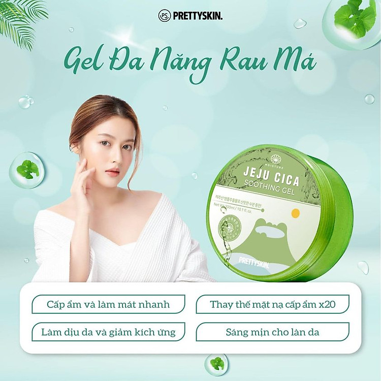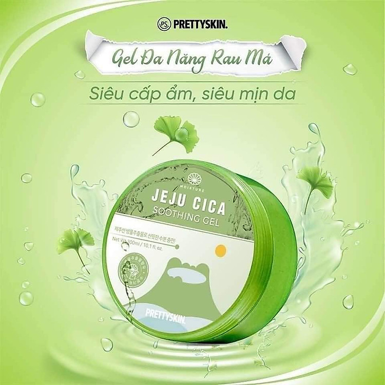 Gel dưỡng da đa năng rau má Jeju Cica Soothing Gel PrettySkin chứa 0,4% tinh chất rau má có tác dụng làm mát da, cung cấp nước tạo độ ẩm cho da, từ đó làm giảm nếp nhăn và khô da…