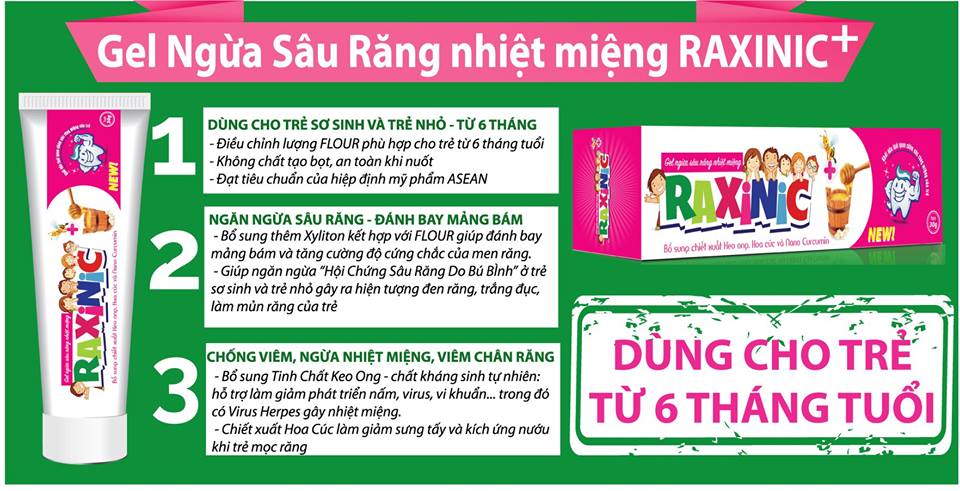 Gel ngừa sâu răng Raxinic giúp bổ sung lượng Flour an toàn giúp răng chắc khỏe, phòng chống hiện tượng đen răng, mủn răng và hỗ trợ phòng ngừa sâu răng, các nguyên nhân gây ra sâu răng, ngăn ngừa nhiệt miệng.