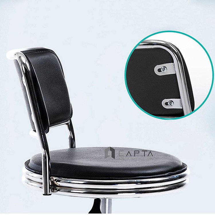 Chân ghế thép mạ chrome bóng sang trọng. Pen ghế có cần gạt nâng hạ từ 38 ~ 51 cm. Cần gạt được bố trí bên phải thuận tiện cho thao tác dễ dàng. Ghế quầy bar thấp chân tăng giảm tùy chỉnh độ cao phù hợp với chiều cao bàn và người ngồi.