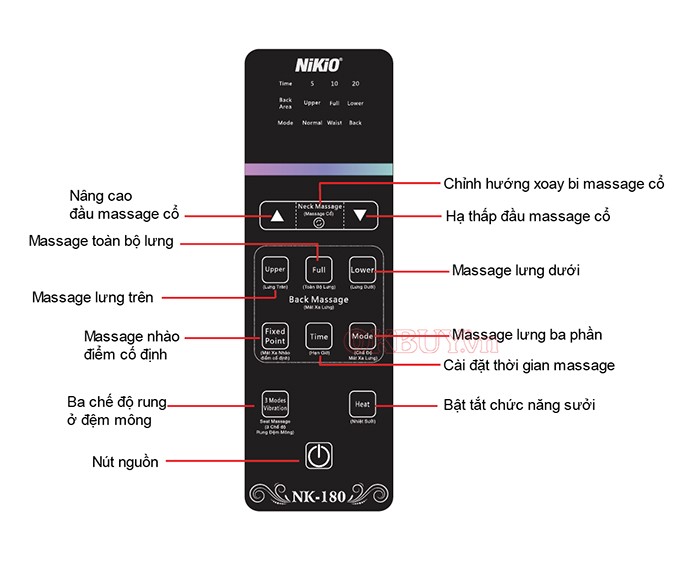 - Nút Heat: Nhấn nút để bắt đầu chức năng nhiệt sưởi cho lưng và cổ (đèn đỏ bật sáng), nhấn một lần nữa để dừng (đèn đỏ tắt).