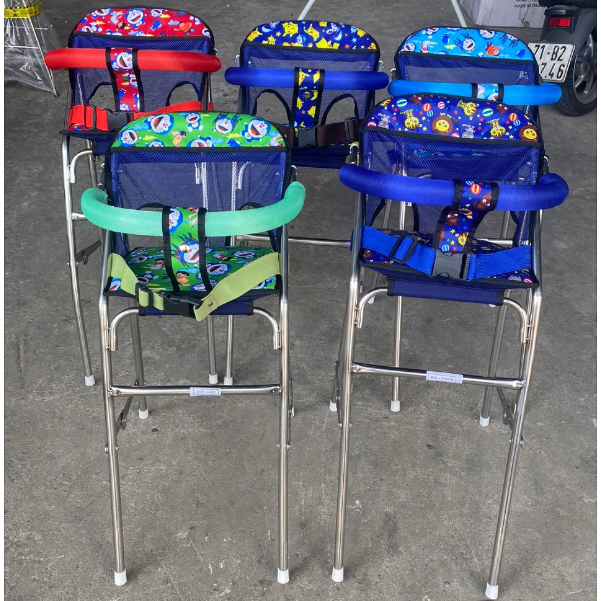 - Chất liệu khung ghế được làm bằng INOX SÁNG BÓNG DÀY DẶN , tránh gỉ sét, có chỗ để chân, nệm ghế êm, và mềm, ghế có vòng bảo hiểm an toàn cho bé , giúp cho em bé thoải mái khi di chuyển , lưng lưới thoáng mát dễ chịu .