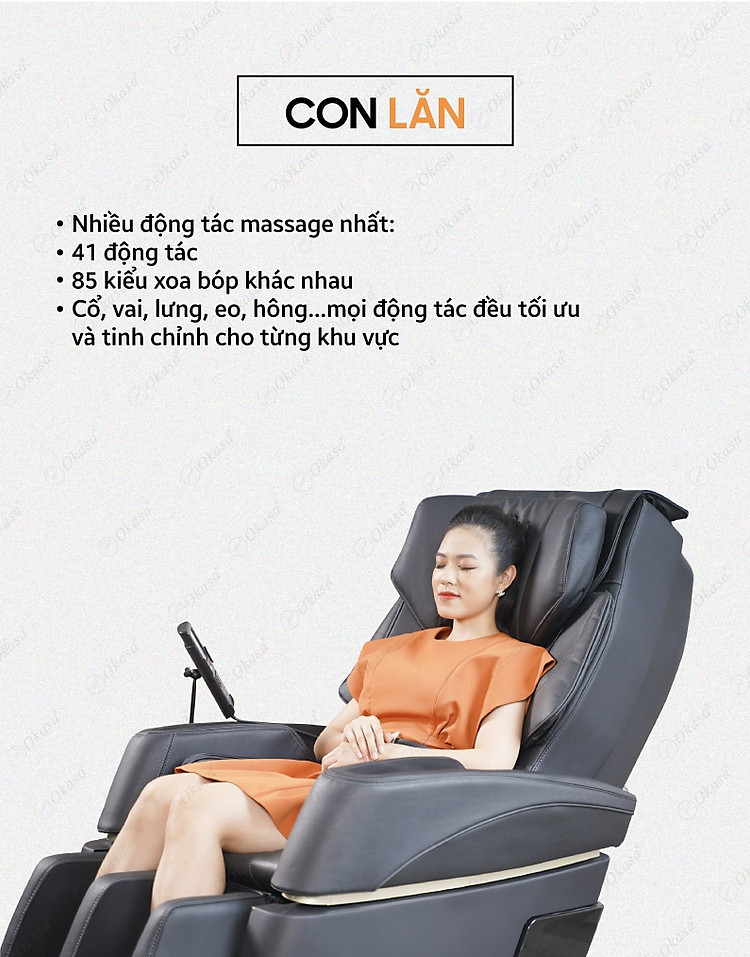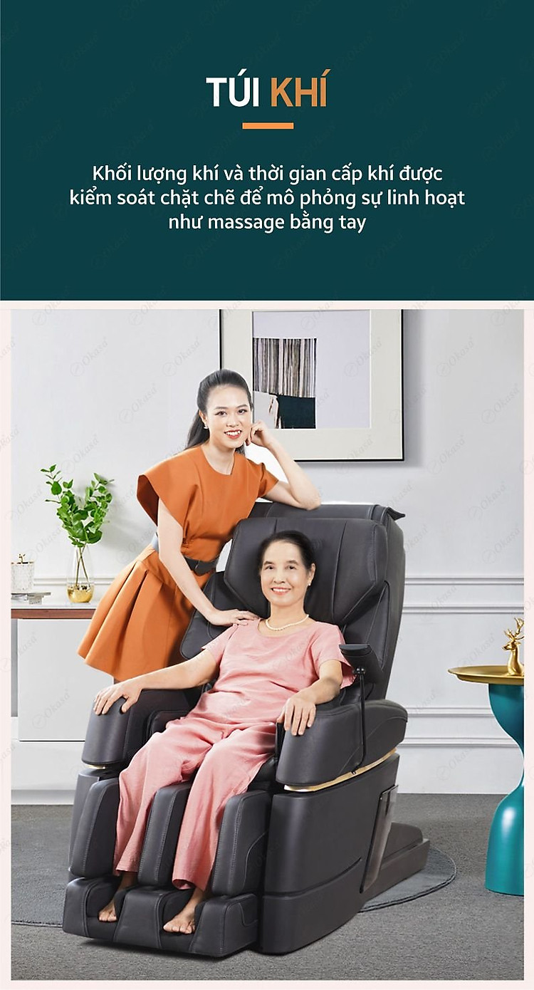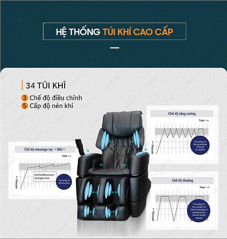 34 túi khí toàn thân ghế cùng 3 chế độ, 5 cấp độ giúp điều chỉnh linh hoạt giữa tốc độ và cường độ nén khí tùy theo sở thích.