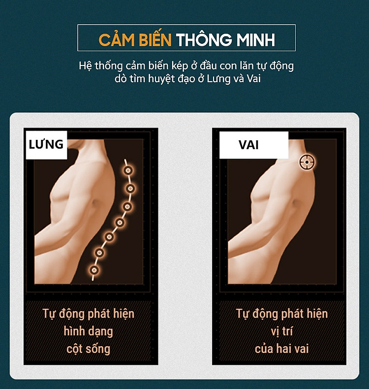 Hệ thống cảm biến kép quét dọc cơ thể và đường cong cột sống, xác định các vị trí thường xuyên đau mỏi; Lập bản đồ khu vực mát xa và thao tác chính xác vào từng bộ phận, vị trí.