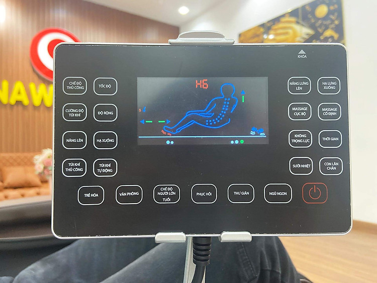 Bảng điêuf khiển hiển thị đầy đủ các thông tin về chế độ Massage, các tuỳ chỉnh Massage về túi khí, cường độ, con lăn, thời gian Massage và các bài tập Massage.