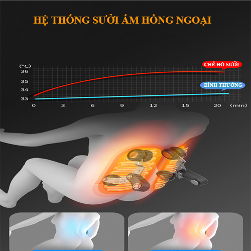 Massage nhiệt hồng ngoại: Nhiệt hồng ngoại được truyền qua các sợi các-bon tích hợp ngay đầu các bi lăn, tỏa nhiệt liên tục khi bi lăn hoạt động, nhiệt xuyên qua da 3mm. Điều này giúp tăng nhiệt độ cơ thể, giãn nở các mạch máu, lưu thông khí huyết, giảm đau, giảm các vết bầm tím.