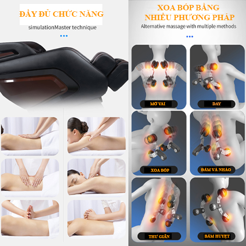 Bài tập Massage: ghế được cài đặt nhiều chương trình Massage tự động từ đơn giản đến chuyên sâu giúp khách hàng có nhiều lựa chọn. Các bài tập này là sự kết hợp của nhiều kỹ thuật Massage khác nhau mang lại hiệu quả cao nhất.