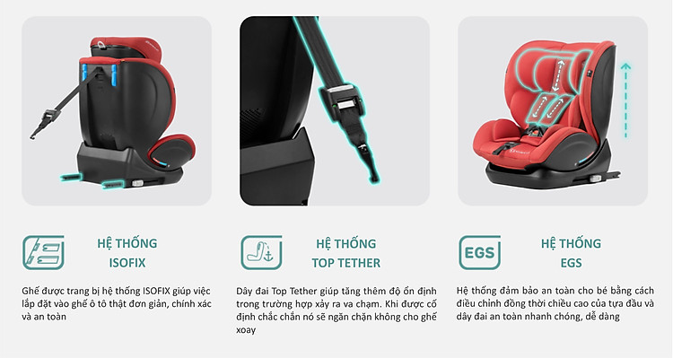 -Hệ thống EGS: đảm bảo an toàn cho bé bằng cách điều chỉnh đồng thời chiều cao và tựa đầu dây đai an toàn nhanh chóng và dễ dàng