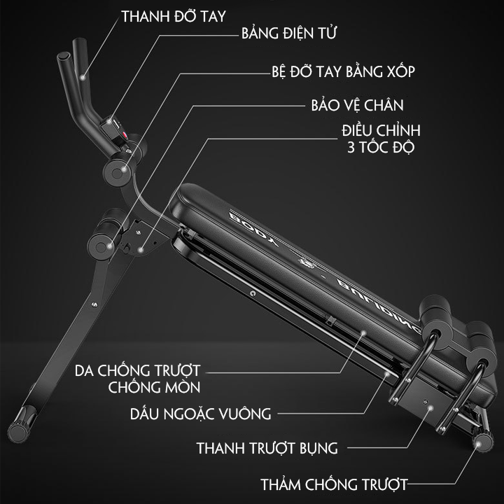 Ghế tập bụng đa năng model mới nhất, máy tập body, bảng điện tử, bệ đỡ bắp tay và chân, thanh và da chống trượt, thanh trượt bụng, thanh đỡ tay cao cấp, tải trọng 150Kg