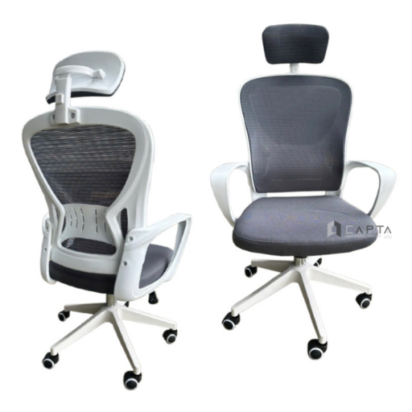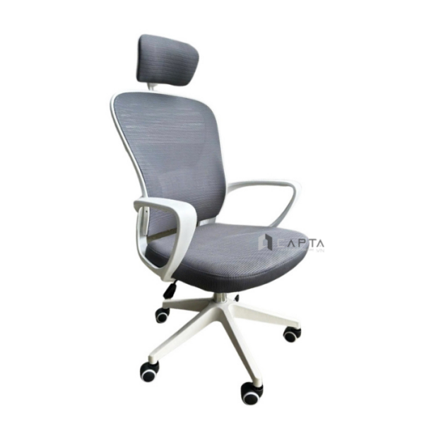 Chất liệu: Lưng lưới cao, có tựa đầu, nệm vải, khung và thân ghế, bánh xe màu trắng. Ghế xoay, nâng hạ.