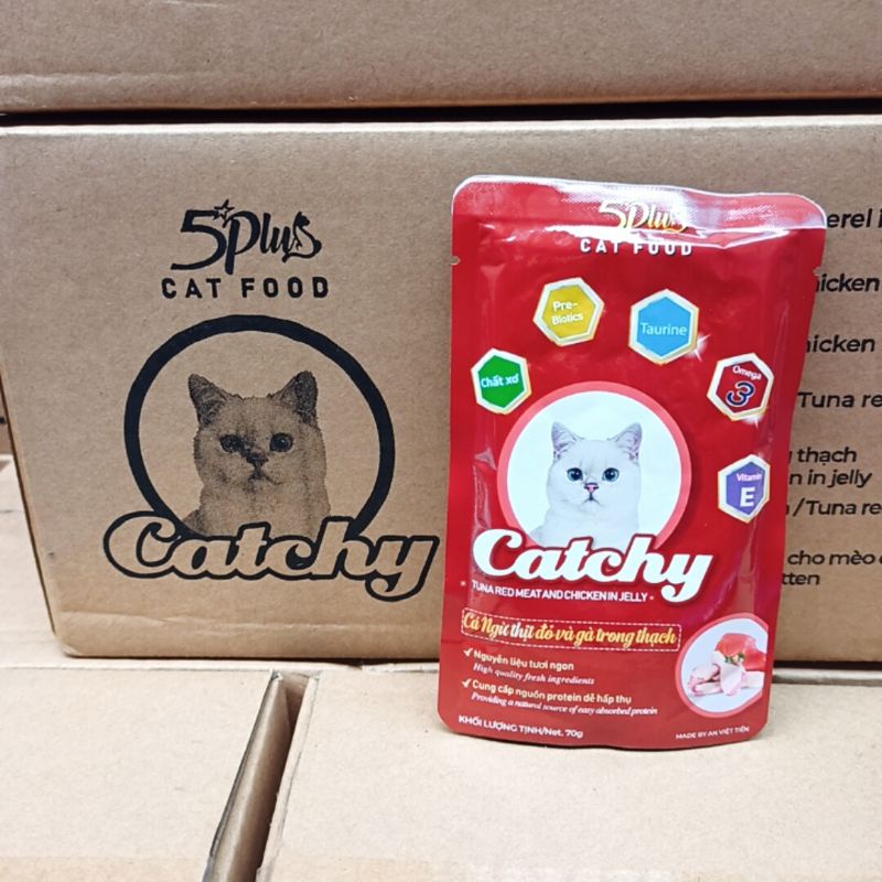 Siêu phẩm Pate Catchy gói 70g cập bến đúng lúc đứa con gái nhõng nhẽo lười ăn vì thèm hơi zai 😆 Vậy mà đổ pate mới ra liếm phát hết cả đĩa Sẵn 5 vị thơm ngon: - Cá ngừ thịt đỏ trong thạch - Cá ngừ thịt đỏ và tôm - Cá nục trong sốt - Cá ngừ thịt đỏ trong thạch cho mèo con - Cá ngừ thịt đỏ và gà trong thạch * Ưu điểm - Nhiều mùi vị thơm ngon, tăng vị giác, phù hợp với tất cả các giống mèo - Taurine giúp bảo vệ tim và mắt. - Prebiotic cải thiện hệ tiêu hoá. - Nguồn vitamin E, B12 cần thiết cho sự phát triển toàn diện - Được sản xuất theo tiêu chuẩn chất lượng BRC do Anh Quốc công nhận