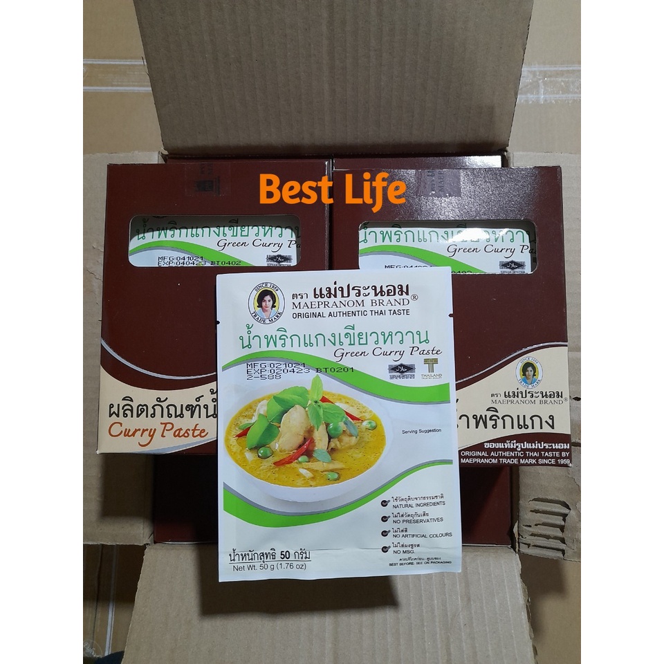 Thực phẩm và đồ uống > Nguyên liệu nấu ăn > Gia vị & Hương liệu > Nước chấm || Gia vị cà ri xanh nhãn hiệu Maepranom 50g dùng để nấu các món cà ri thơm ngon hương vị Thái Lan