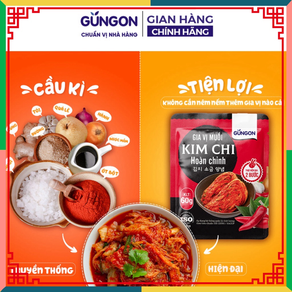 Sản phẩm: Gia vị muối kim chi Thương hiệu: GUNGON Xuất xứ: Việt Nam Trọng lượng: 60gr HSD: 12 tháng kể từ ngày sản xuất