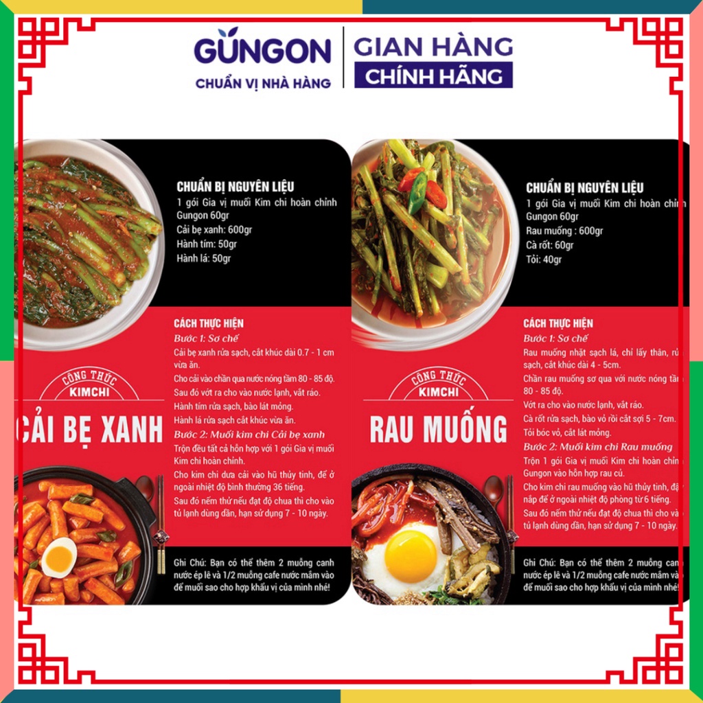 HƯỚNG DẪN SỬ DỤNG GIA VỊ MUỐI KIM CHI - Bước 1: Chuẩn bị & sơ chế nguyên liệu + 1 gói gia vị muối kim chi hoàn chỉnh Gungon + 600gram cải thảo + 100gram cà rốt, củ cải trắng, hẹ + Cải thảo cắt khúc vừa ăn rửa sơ + Cho 1,5 muỗng canh đầy muối vào trộn đều để trong 2 giờ + Rửa sạch cải thảo với nước qua 4-5 lần và vắt ráo + Cà rốt, củ cải trắng, hẹ cắt sợi vừa ăn - Bước 2: Muối kim chi Hàn Quốc + Trộn đều các nguyên liệu trên với 1 gói gia vị muối kim chi hoàn chỉnh Gungon + Cho hỗn hợp vào hũ sạch, đậy kín 5-6 giờ tùy khẩu vị của bạn có thể tăng thời gian lên men + Cho kim chi đã lên men vào tủ lạnh ngăn mát qua đêm + Thưởng thức thành quả thôi nào * Bảo quản kim chi ở ngăn mát tủ lạnh và sử dụng dần từ 5-7 ngày