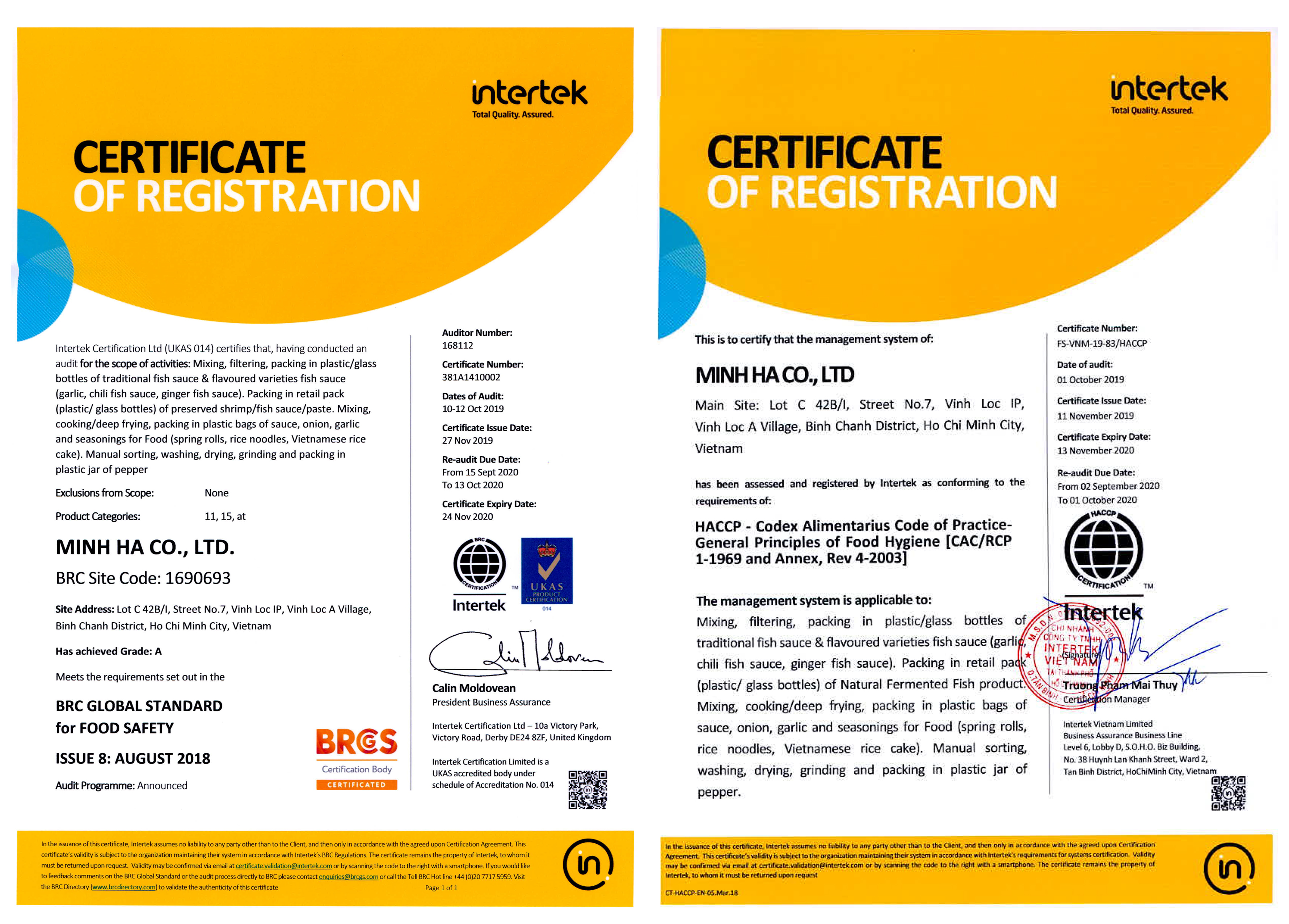 CƠ SỞ ĐÃ ĐƯỢC CHỨNG NHẬN PHÙ HỢP THEO TIÊU CHUẨN HACCP, BRC TOÀN CẦU