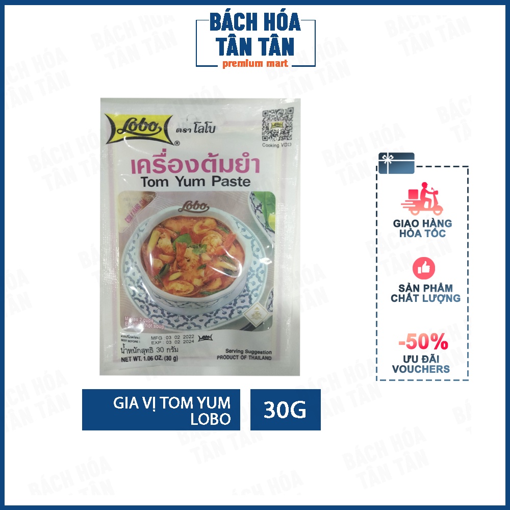Gia vị nấu Tomyum cay hiệu Lobo Thái chính hãng, gói 30g THÔNG TIN VỀ SẢN PHẨM Gia vị Lẩu Thái Cay là lọai nước sốt được pha sẵn vừa ăn, dùng để chế biến lẩu thái. Sản phẩm đã bao gồm các loại gia vị cần thiết, khi náu nước dùng lảu thái không cần phải chuẩn bị thêm gia vị. Thành phần: muối (25%), đường (21%), dầu đậu nành (19%), xả (9,5%), chất điều vị (bột ngọt) (INS 621) (4,9%), chất điều chỉnh vị chua (citric acid), INS 330 (4,2%), bột ớt, me, hẹ Tây, tỏi, củ giềng, nước chanh Hướng dẫn sử dụng: dùng để tẩm ướp các món cá, trai, sò điệp và các loại thịt khác. Nhúng gói gia vị vào nước nóng khoảng 1 phút. Sau đó, mở bao bì và sử dụng. Bảo quản nơi thoáng mát, tránh ánh nắng trực tiếp - Trọng lượng tịnh: 30g/gói - Xuất xứ: Thái Lan - HSD: 2 năm