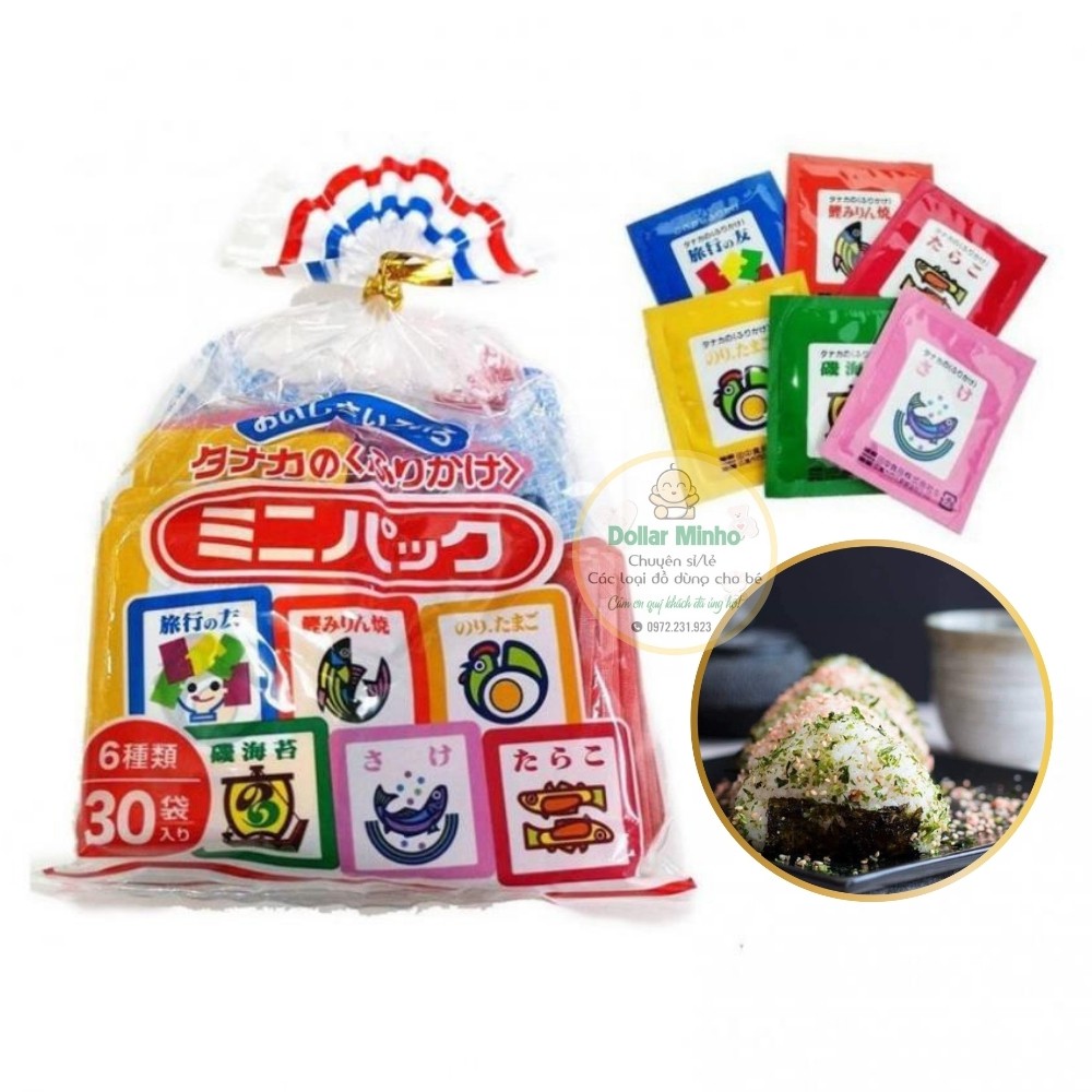 Gia vị rắc cơm nội địa Nhật cho bé ăn dặm 6 vị date mới dành cho bé từ 8m+ Gia vị rắc cơm Tanaka Furikake gồm 30 gói nhỏ chia làm 6 vị khác nhau: - Cá thu rong biển. - Cá ngừ nướng Mirin. - Trứng rong biển. - Rong biển. - Cá hồi. - Trứng cá tuyết.