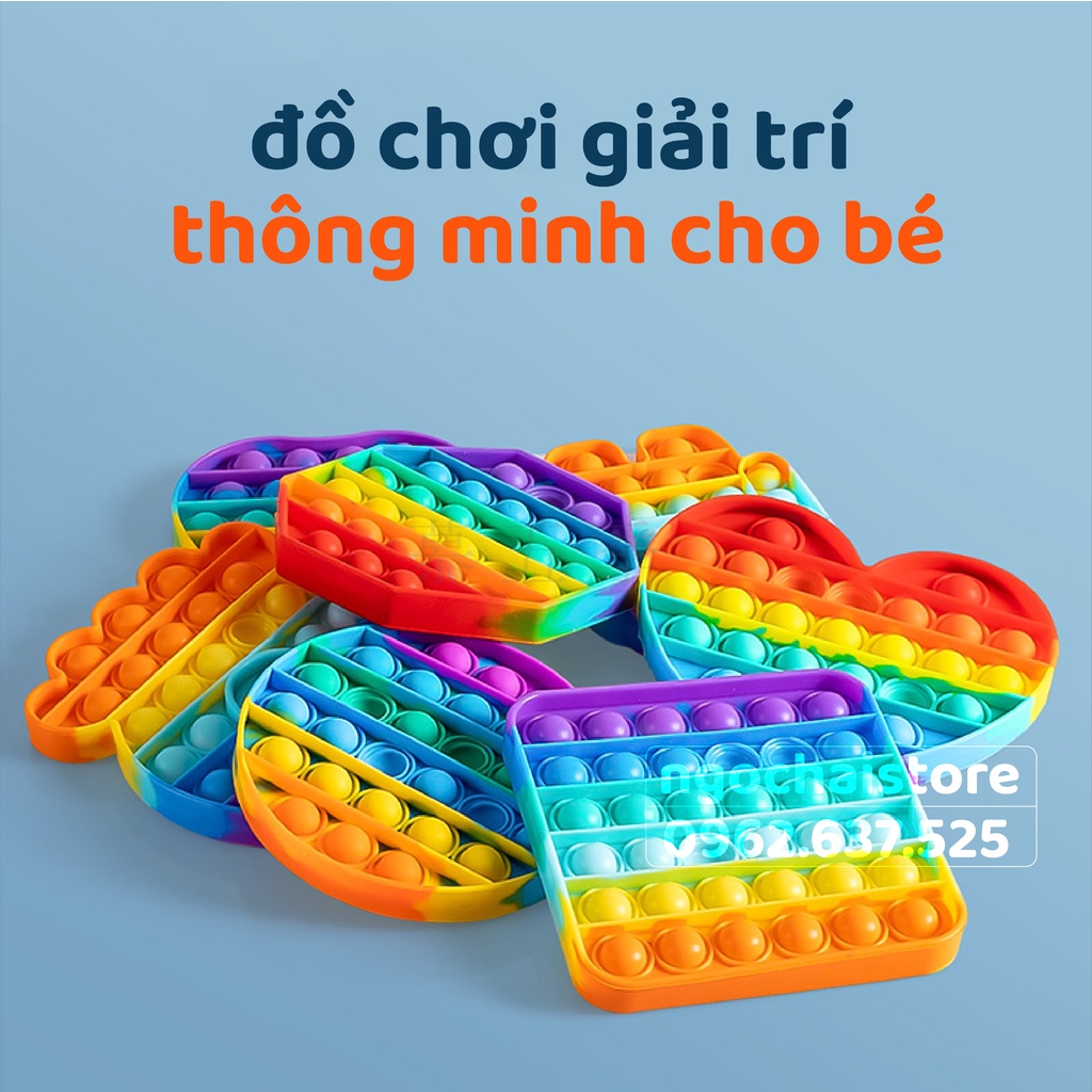 Khi bạn đang stress hoặc chán nản mệt mỏi hay căng thẳng trong công việc thì Pop It sẽ là món đồ chơi giúp giải tỏa căng thẳng đáng kể, Sản phẩm có nhiểu màu sắc và hình dạng độc đáo. Đây cũng là món quà, đồ chơi cho các bé chơi ở nhà giúp trẻ có thể phân biệt màu sắc, tập đếm,... Đặc biệt không độc hại với chất liệu silicon 1. Tuyệt vời để giảm lo âu & căng thẳng: Đồ chơi Đồ chơi Pop It fidget toy được thiết kế một mặt phẳng và một mặt gồ ghề. Đồ chơi này có thể giúp giảm lo lắng và căng thẳng một cách hiệu quả và giúp phục hồi tâm trạng. m thanh " Pop, Pop, Pop "nghe rất thú vị và giải tỏa cảm xúc, lý tưởng cho những người mắc chứng tự kỷ, ADHD, người già, trẻ em và người lớn, những người cần giải tỏa căng thẳng. 2. Đồ chơi bóp vui nhộn: Trò chơi Pop It tuyệt vời dành cho phụ huynh - con cái, bạn bè, chỉ cần nhấn các quả bóng xuống và chúng tạo ra âm thanh vui tai; sau đó lật lại và bắt đầu nhấn lại! Người chơi thay phiên nhau và nhấn xuống bất kỳ số lượng bóng nao trên một hàng. Người chơi nào nhấn xuống cuối cùng sẽ thua cuộc. Trò chơi bóp bong bóng này có thể rửa sạch và tái sử dụng liên tục 3. An toàn & Bền bỉ: Đồ chơi bóp bong bóng được làm bằng silicone cao cấp 100% thân thiện với môi trường, dễ dàng rửa sạch và có thể tái sử dụng. Đồ chơi mềm, thoải mái, có thể rửa sạch lại, bền và có thể ép nhiều lần trong thời gian dài. Bạn không cần lo lắng đồ chơi của con bạn sẽ bị hỏng nữa. 4.Thời trang & Kết hợp đa dạng: Đồ chơi Pop It fidget toy có màu sắc tươi sáng có thể khơi dậy sự quan tâm của trẻ, rèn luyện tư duy toán học, chiến lược suy luận, tính nhẩm, tư duy logic và kỹ năng vận động tinh. 5. Hoàn hảo vui chơi khi đi du lịch: Đồ chơi Pop It fidget toy này rất thuận tiện để mang theo khi đi du lịch và bạn có thể chơi trên ô tô, máy bay, nhà hàng, cắm trại, trường học và văn phòng ở bất cứ đâu. Món quà hoàn hảo cho trẻ em / bạn bè / người già, đồ chơi lý tưởng mang theo khi đi ra ngoài giúp bạn luôn bận rộn trong thời gian dài