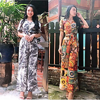 Jumpsuit ngắn cổ vest, vải mịn mát, họa tiết đẹp