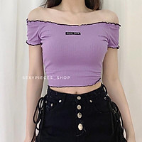 top tím trễ vai viền đen
