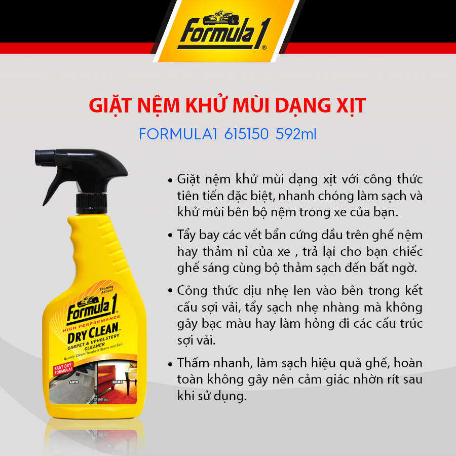 Giặt nệm khử mùi dạng xịt FORMULA1 615150 592ml giúp làm sạch ghế nệm nhanh chóng, an toàn, hiệu quả