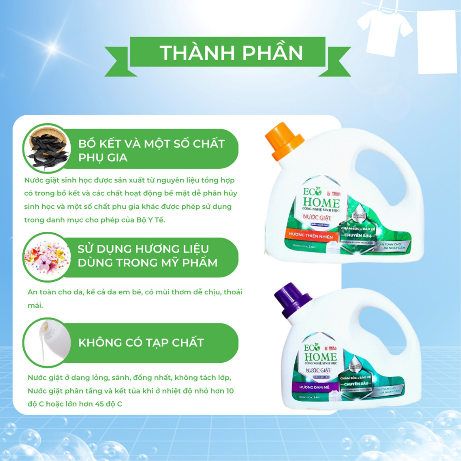 - Nước giặt ở dạng lỏng, sánh, đồng nhất, không tách lớp