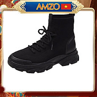 Giày bốt cổ thấp Martin cho nữ, boots cổ thấp có dây màu đen cổ tròn phối len