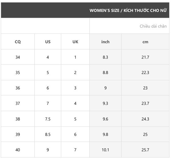 CHRISTINA-Q hiện đang sử dụng định cỡ Châu Á / Châu Âu cho giày dép của mình.