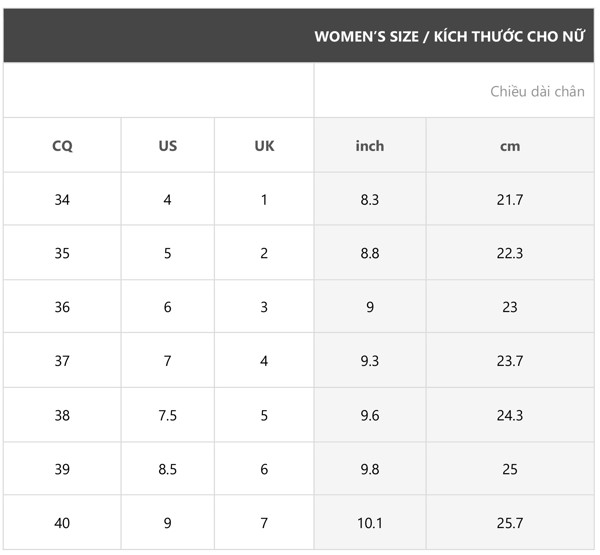 Biểu đồ kích thước được đề xuất hiện tại không bao gồm các khuyến nghị về kích thước nửa. Chúng tôi khuyên bạn nên chọn cỡ giày dựa trên chiều dài gần nhất với số đo chân của bạn.