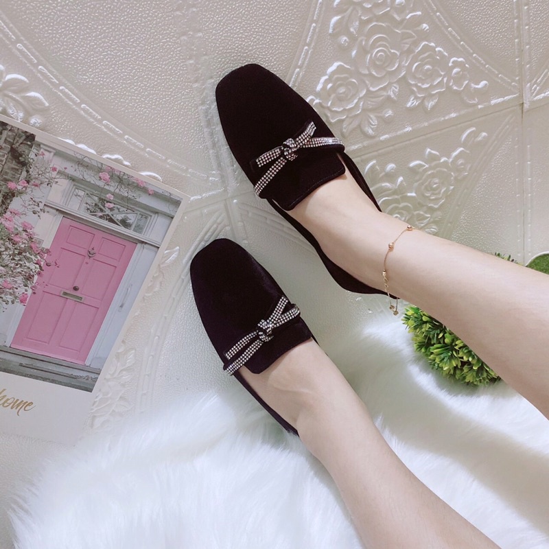Giới thiệu Giày búp bê nơ đá chất nhung mịn Hq mũi vuông cực tôn chân không kén da dễ đi
