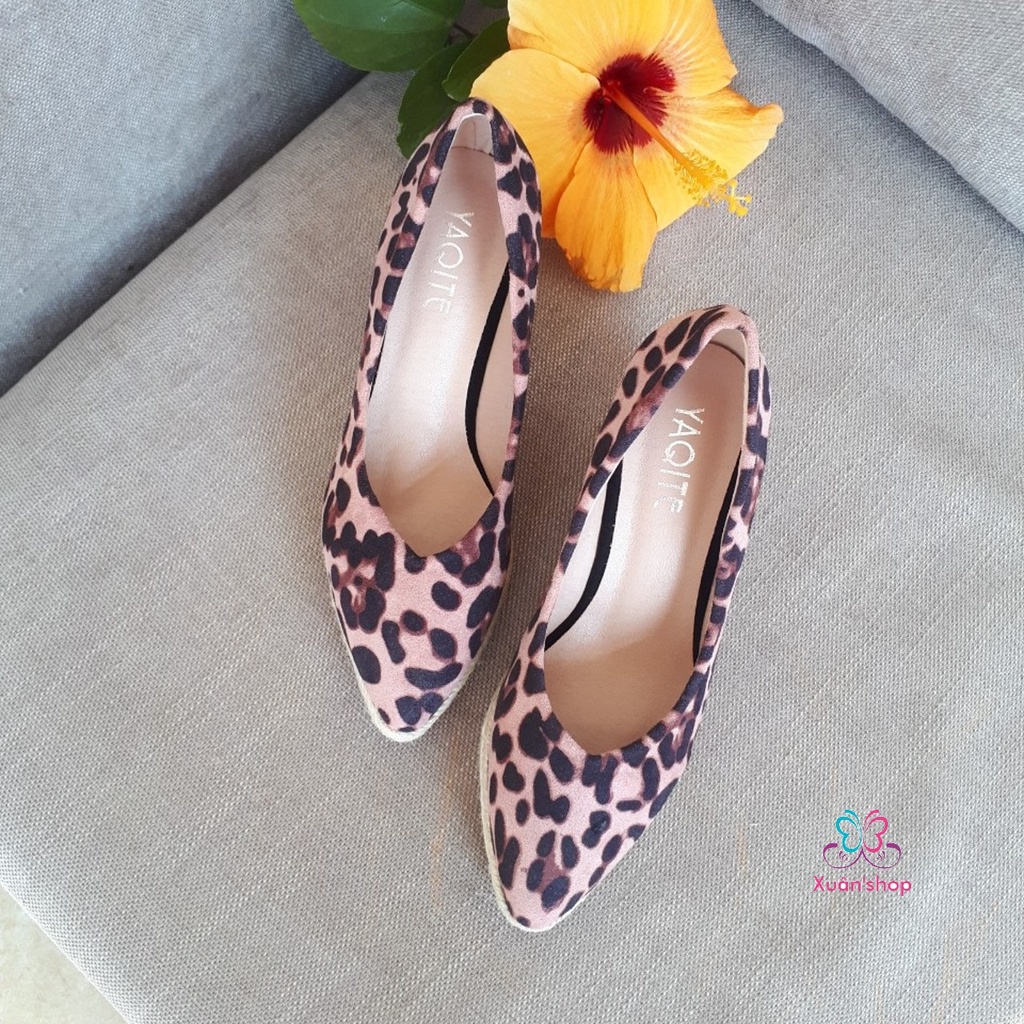 Giới thiệu Giày cao gót họa tiết da beo thời trang, đế xuồng bọc cói cao 7cm (size 36, 37)