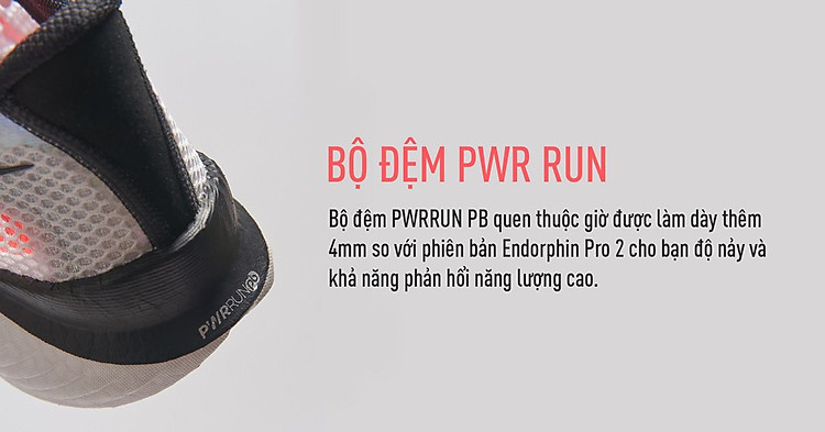 Bộ đệm PWRRUN PB quen thuộc giờ được làm dày thêm (4mm so với phiên bản Endorphin Pro 2) cho bạn độ nảy và khả năng phản hổi năng lượng cao. Tuy bề ngoài có phần hầm hồ nhưng trọng lượng vẫn nhẹ tới mức kinh ngạc (chỉ 204g ở size 9US Nam).