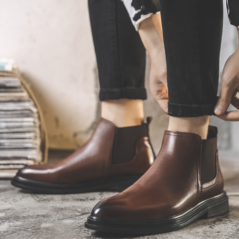 Giày Chelsea Boots Cổ Lửng Màu Nâu Da Bò Nguyên Tấm Đế Cao Su Tăng Chiều Cao