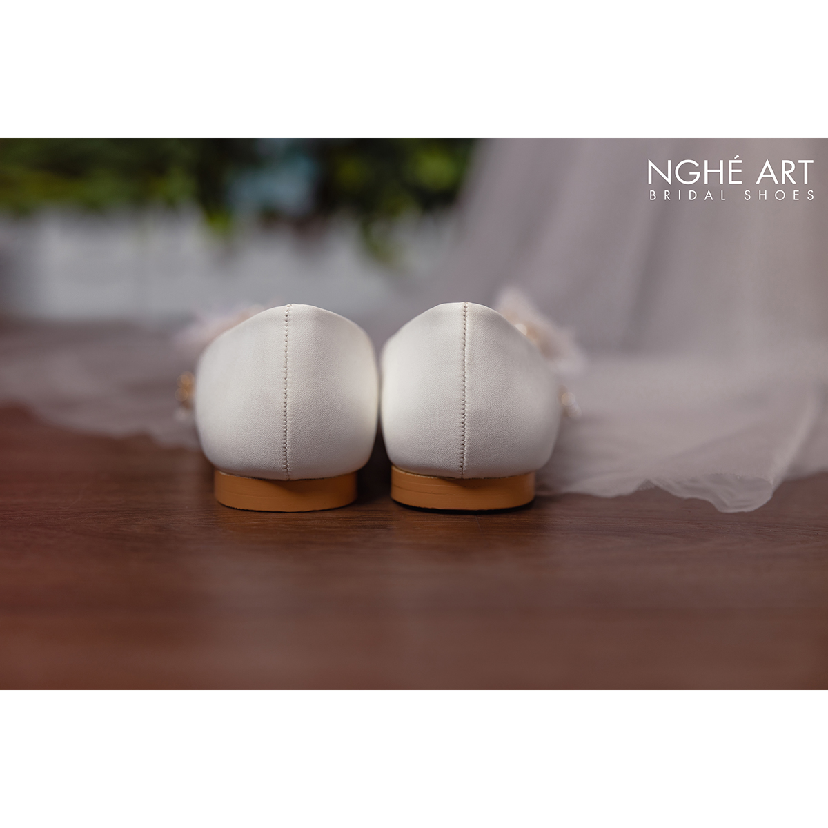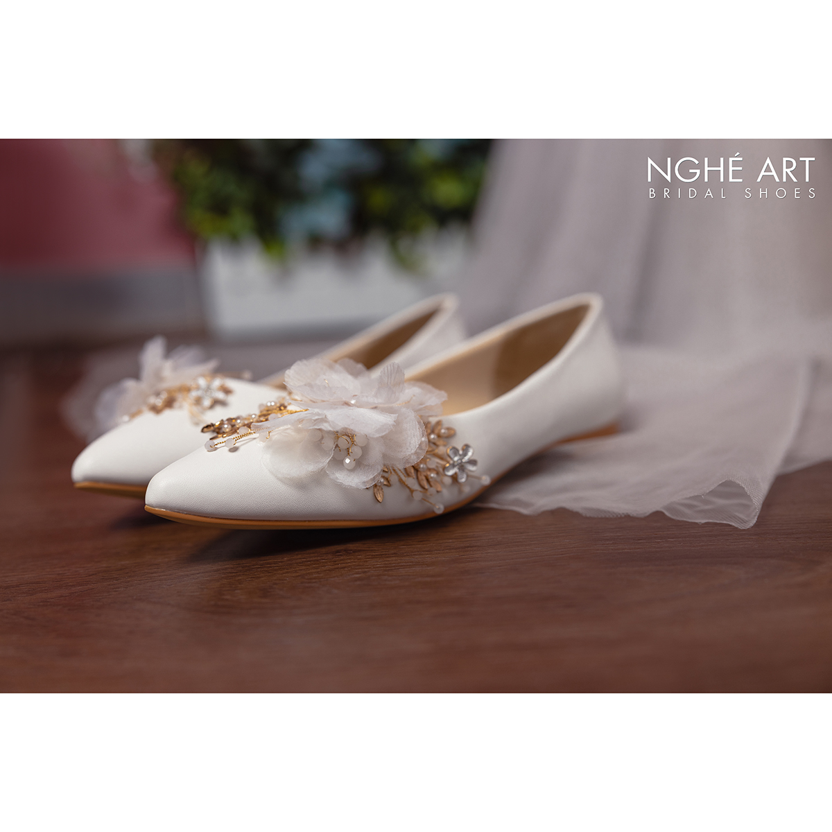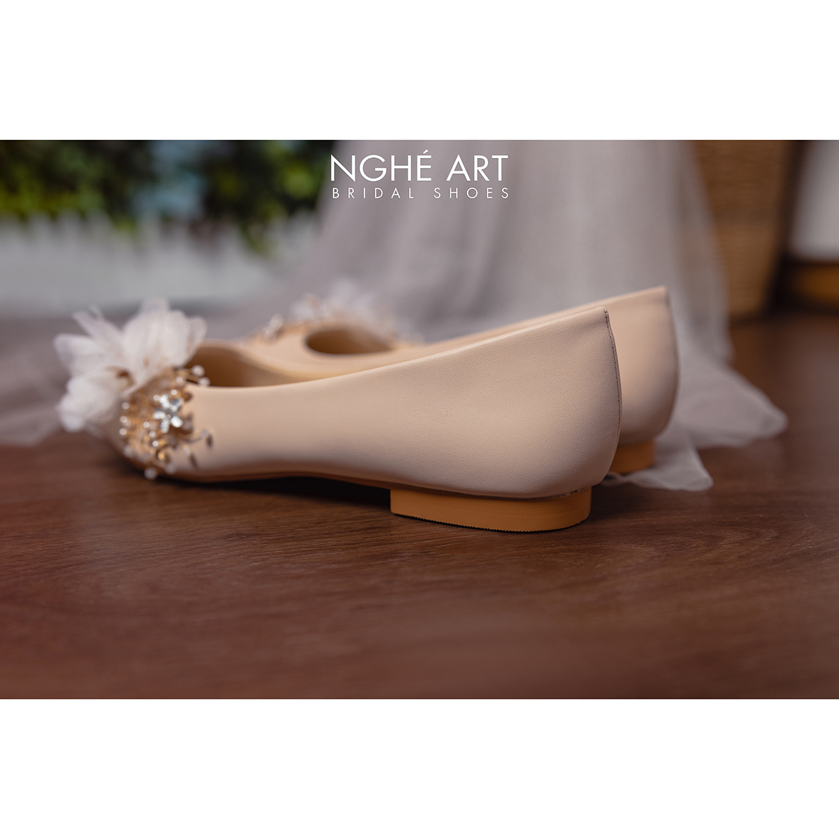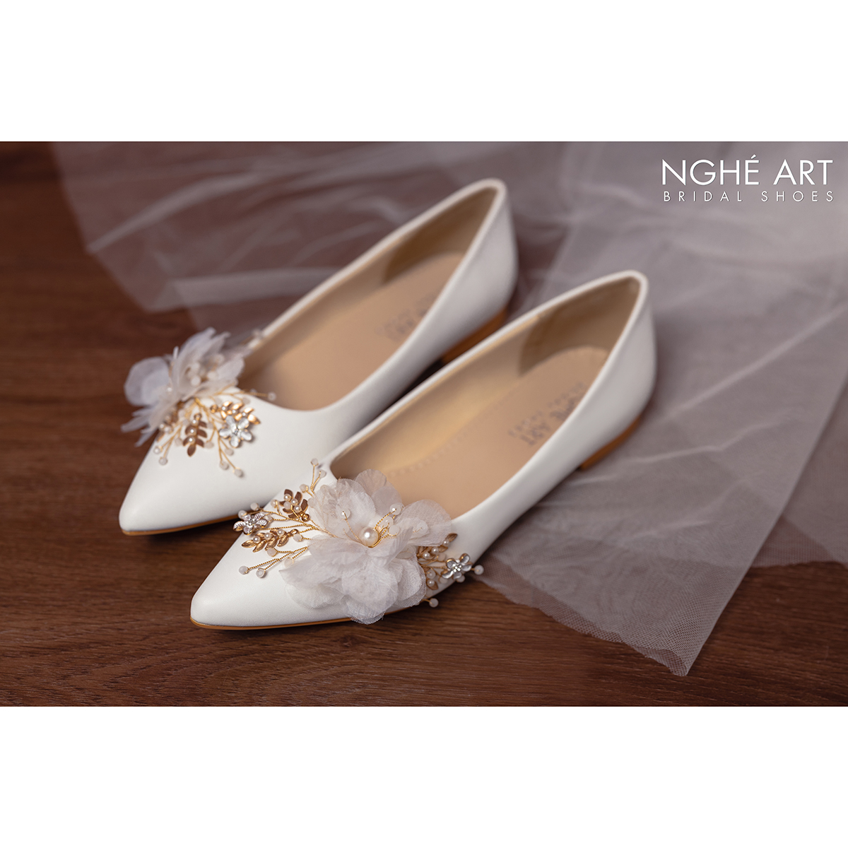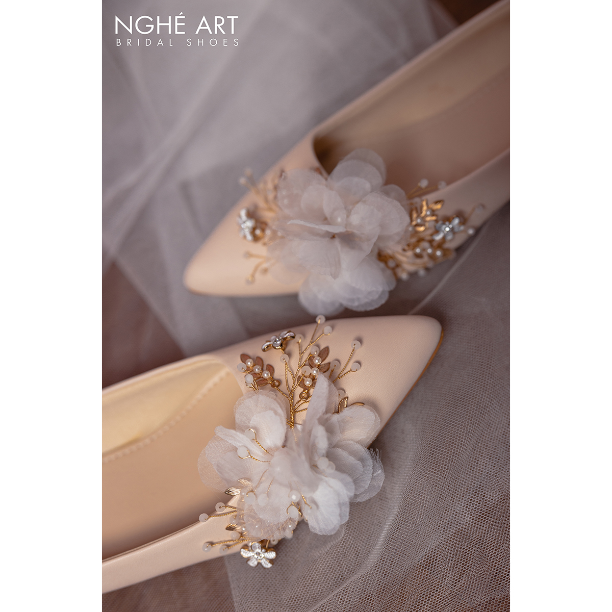 Giày chất liệu da mờ, đính kết hoạ tiết hoa voan