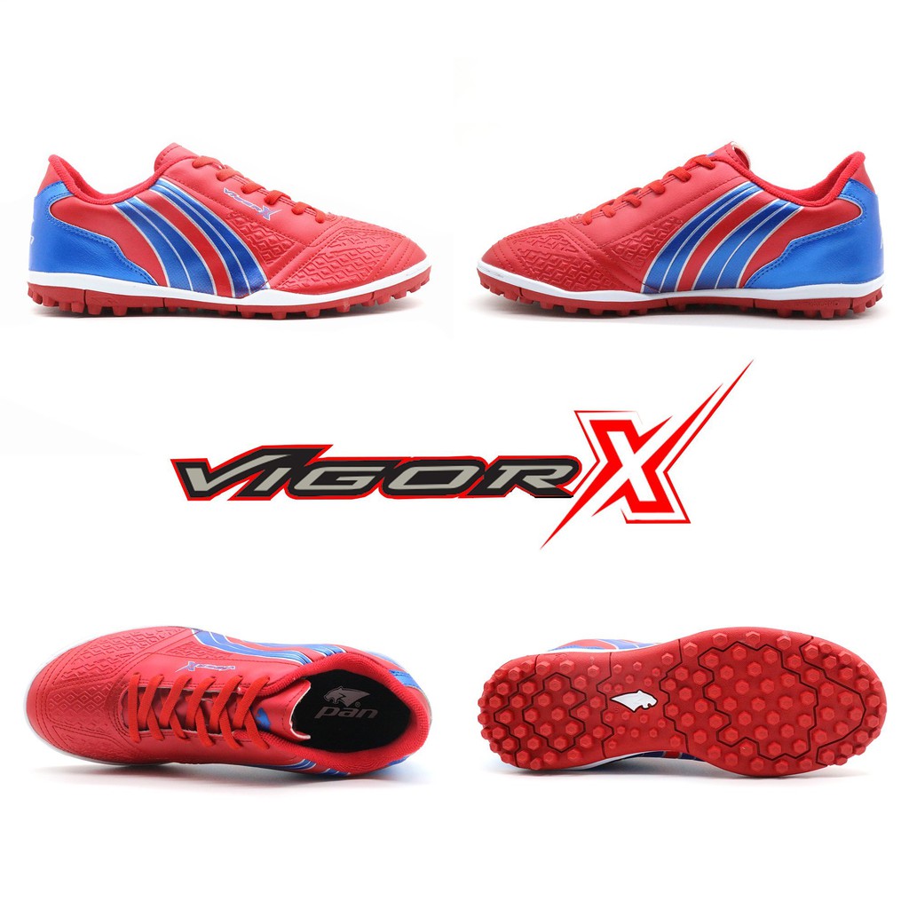 Giày đá banh trẻ em Pan Vigor X đế Đinh TF chính hãng 5 màu cao cấp có những đặc điểm nổi bật như sau: -Giày Pan Vigor X TF - mẫu giày đá bóng dành cho mặt sân cỏ nhân tạo -Giày Pan Vigor X TF là sản phẩm mới nhất của Pan .Thiết kế ở giày Vigor X mang đến sự khác biệt trong các đường vân ở trên thân giày để tạo bề mặt tiếp xúc bóng tốt -Thân giày được làm từ da mờ ELVALOY PU, đảm bảo độ bền cũng như khả năng chống bám bẩn, chống thấm nước. -Phần da giày ở phía gần gót được thiết kế với lớp da khác màu được may cực chuẩn giúp đôi giày trông cũng đẹp mắt hơn. -Mũi giày được dán keo và khâu may chắc chắn, tăng lực cho những pha chích mũi sở trường. -Miếng lót giày của đôi Pan Vigor X TF khá dày ở phần gót, tạo độ êm cho gót chân và hạn chế những chấn thương ở -vùng cơ thể rất dễ bị tổn thương này.Đế giày được tạo nên từ cao su tổng hợp có độ bền và độ chịu mài mòn cao. -Lớp đinh hình lục giác giúp thăng bằng và bám sân tốt. Đế giày có các đường rãnh phân khúc giúp đế có độ dẻo. -Form giày bè ngang phù hợp cho những người chân to, múp. -Lưỡi gà rời có lỗ xỏ dây giày giúp cố định lưỡi gà không bị dịch chuyển.