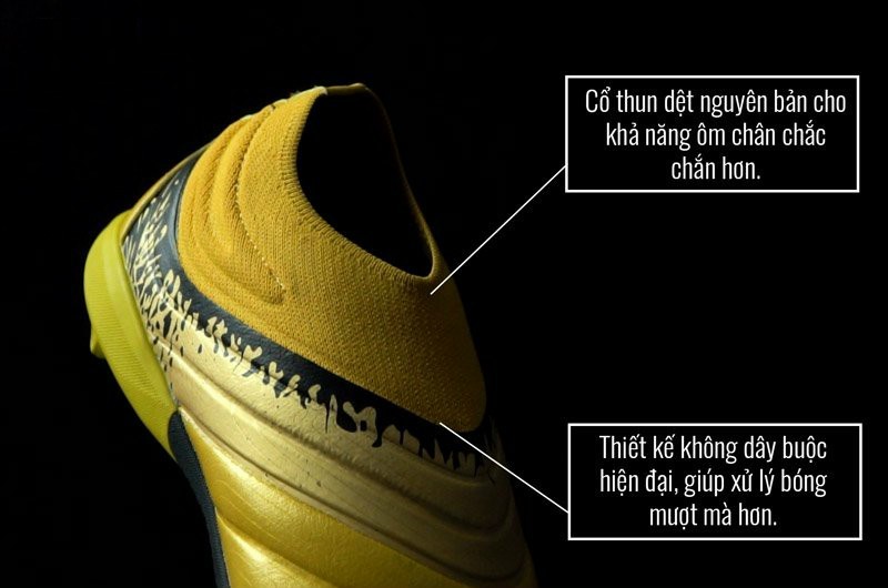 Cổ giày được làm từ thun dệt nguyên bản cho cảm giác ôm chân chắc chắn giúp bảo vệ cổ chân và hạn chế chấn thương mỗi khi dùng lực sút mạnh ở cổ chân.