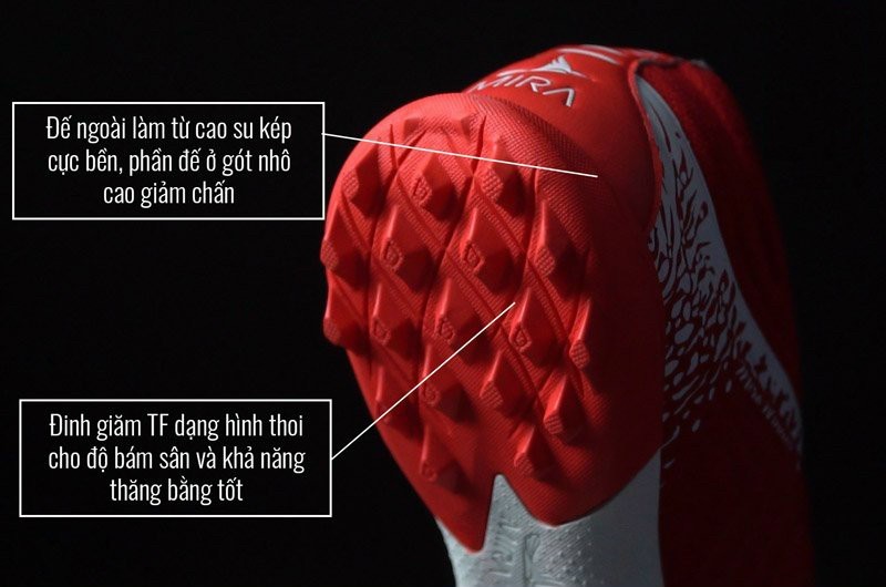Đế giày được làm từ cao su kép kết hợp với đinh dăm hình thoi có kích thước to nhỏ khác nhau giúp bám sân cực chắc, bạn sẽ không còn lo ngại các vấn đề như sân ẩm ướt hay trơn trượt khi sử dụng. Chính nhờ vào kích thước khác nhau của đinh dăm nên các cú đón gót tiếp xúc với mặt sân vô cùng hoàn hảo.