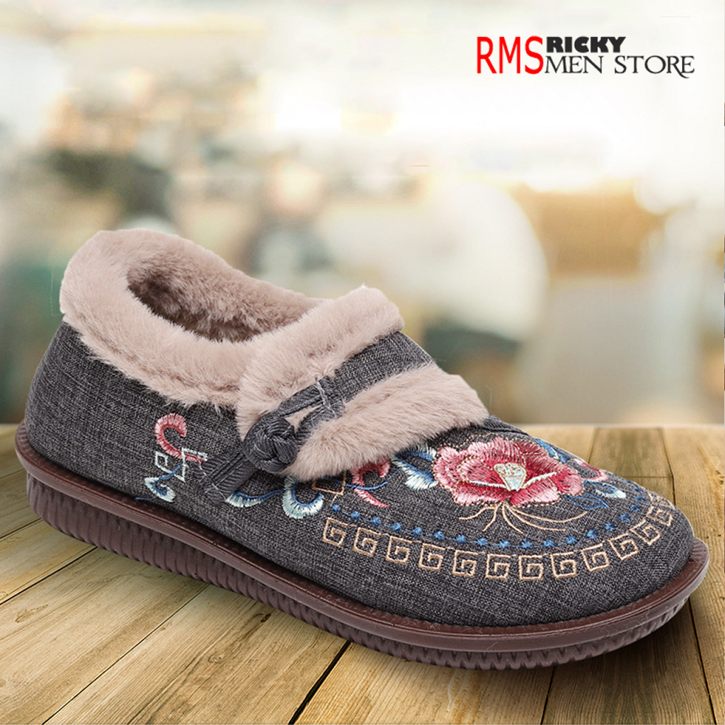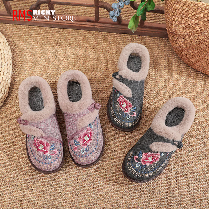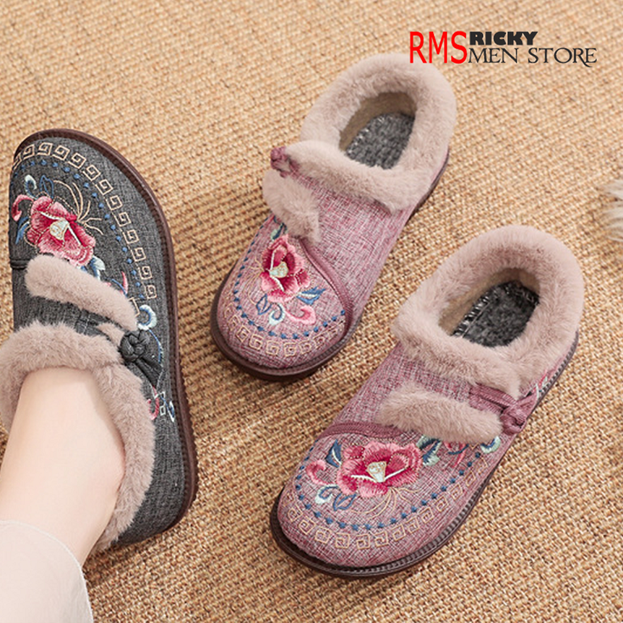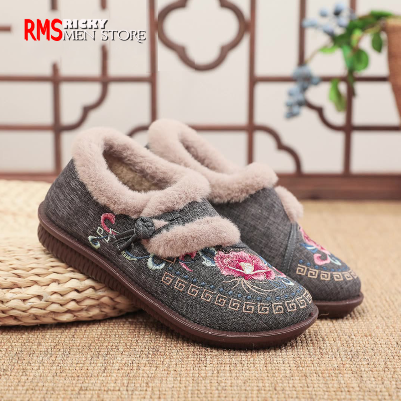 Giày trung niên nữ thêu hoa, trần bông ấm áp mùa đông cao cấp cho bà cho mẹ