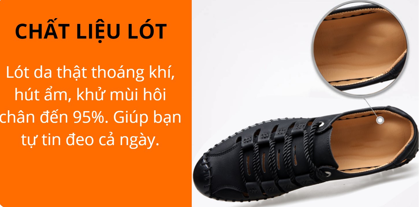 - Chất liệu mặt trong: Da thuộc mềm mại cùng với đệm lót mềm mịn, êm ái mang đến cảm giác thoải mái dễ chịu khi di chuyển hay vận động cùng với khả năng hút ẩm tốt, bảo vệ đôi chân của bạn luôn khô thoáng, hiệu quả ngăn mùicho bạn yên tâm sử dụng.