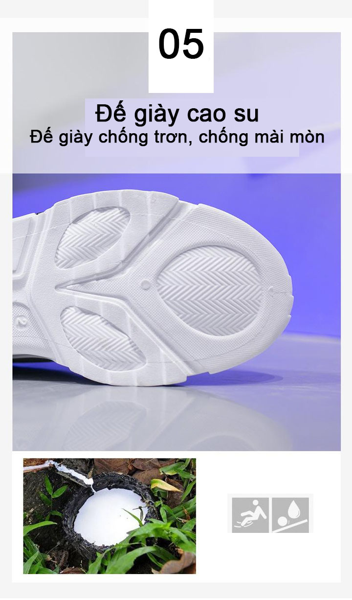 Đế giày cao su dày, bền và thời trang, hoa văn thiết kế phù hợp với cá tính, không những chống trơn trượt, mà còn mềm mại nhẹ nhàng, đi lại càng thoải mái yên tâm hơn Chống trơn - dễ dàng giặt sạch