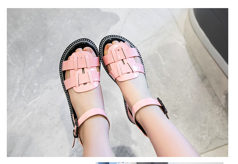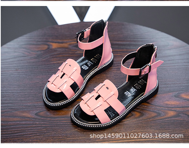 - Giày sandal chiến binh bé gái có kiểu dáng bốt xăng đan cổ cao vừa có gót hậu, đế bằng. Xu hướng mới năm nay. Mũi giày thiết kế đan dây cá tính, bắt mắt. Giày rất xinh và chắc chắn. Phía sau gót có khoá kéo tiện lợi. Da bóng dễ vệ sinh.