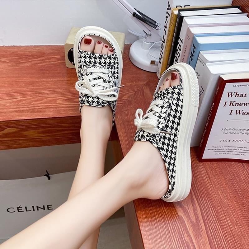 Dép quai ngang, dép sục nữ dây buộc hở mũi đế bánh mì hai màu đen, kẻ caro