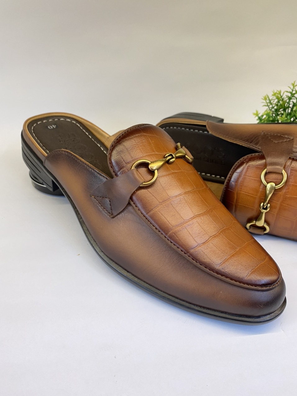 -Giày sục nam da bò-S79 Màu nâu đập vân cá sấu được sản xuất bằng công nghệ hiện đại ép keo nóng đế khâu chắc chắn.