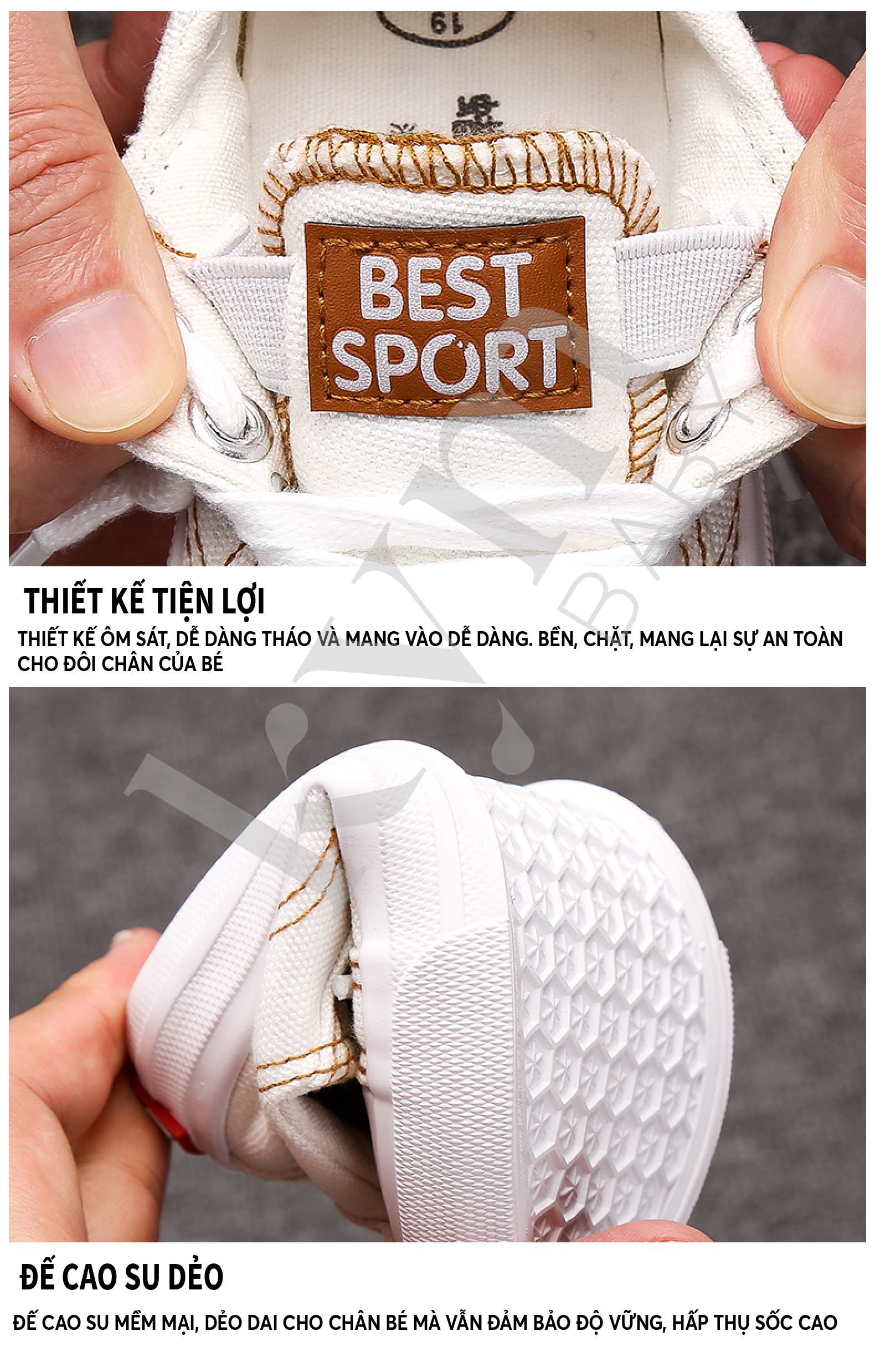 * Mẫu giày thể thao Best Sport vẫn đang chiếm vị trí “Best seller” các mẹ ơi một trong những mẫu giày nên có. Là kiểu dáng không bao giờ lỗi mốt, giày thể thao trẻ em cho bé trai và bé gái, đang rất đươc nhiều khách hàng tin dùng và lựa chọn. Đế êm, chống trơn trượt và chắc chắn. Giày có thể phù hợp với mọi kiểu quần áo. - Chất liệu: Canvas. - Size: 18 -36 - Màu: Đen, Trắng, Hồng, Xám. *Ưu điểm sản phẩm: + Đế mềm, bền và chắc chắn + Kiểu dáng thời trang, dễ phối với quần áo + Bên trong lót nỉ thấm hút tốt giúp bé mang thoải mái và êm chân + Tính ứng dụng sản phẩm cao.* CÁCH CHỌN SIZE CHO BÉ Chiều dài bên trong giày/dép (size cần chọn) = chiều dài chân + 0.5cm (Hoặc 1cm với chân bé dày)