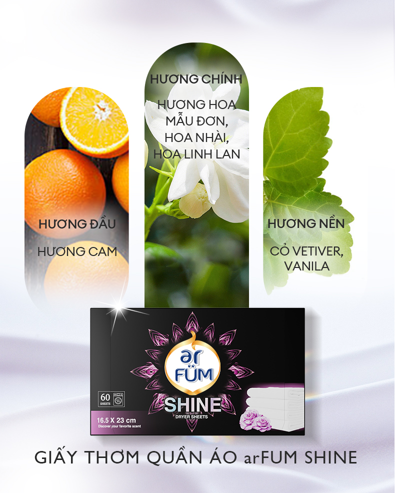 Đặc điểm/ Công dụng- Giấy sấy thơm quần áo Arfum giúp loại bỏ mùi khó chịu và chống tĩnh điện hiệu quả.- Chứa tinh dầu nước hoa thiên nhiên giúp lưu hương lâu sau khi sử dụng.- Giấy sấy thơm quần áo Arfum dùng được cho cả quá trình sấy và phơi quần áo.- Phù hợp sử dụng cho máy sấy và máy giặt có chế độ sấy.Cách dùng- Lấy 1 tờ mới đặt lên trên quần áo khi bắt đầu sấy. Vứt bỏ sau mỗi chu kỳ máy sấy. Cài đặt nhiệt độ thấp cho vải tổng hợp.* Lưu ý: Trong trường hợp bị đốm, hãy làm ướt vải và chà bằng chất tẩy dạng lỏng rồi xả hoặc giặt lại.Bảo quản: Ở nhiệt độ phòng, nơi khô ráo thoáng mátCảnh báo- Để xa tầm tay trẻ em- Nếu dính phải vào mắt, rửa kỹ bằng nước và tìm sự chăm sóc y tế- Nếu nuốt phải, hãy tìm chăm sóc y tế ngay lập tức và đem theo sản phẩm này