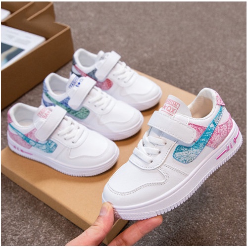 Giày trẻ em mùa thu mới kiểu dáng thể thao cho bé trai và gái đế phẳng giản dị giày trắng da giày đế mềm